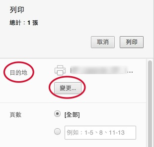 - 在列印對話方塊中,選擇變更目的地。