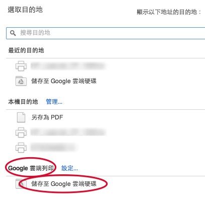 - 把列印目的地改為:Google 雲端列印 > 儲存至 Google 雲端硬碟。