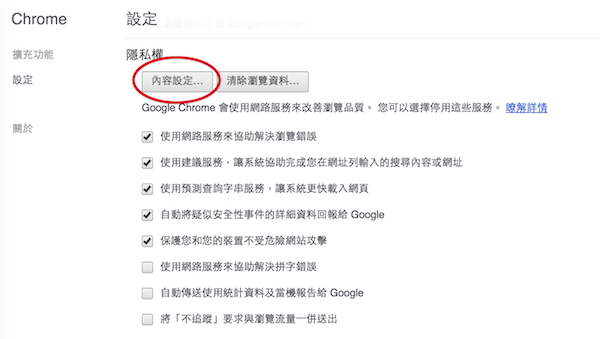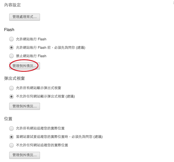 我們進入 Chrome 的偏好設定>隱私權>內容設定...>Flash這個區塊,