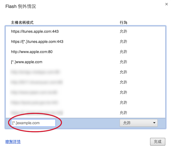 然後將原本預設的:『允許網站執行 Flash 前,必須先詢問你(建議)』,